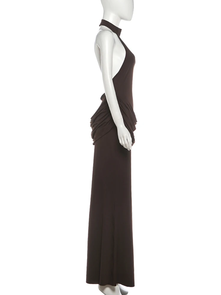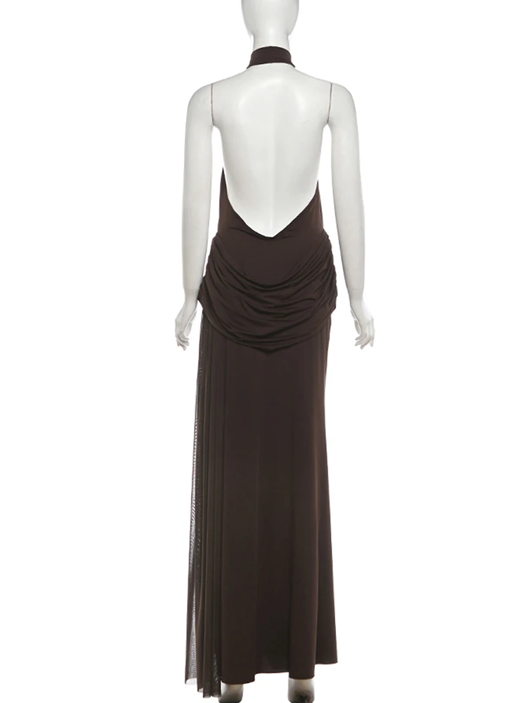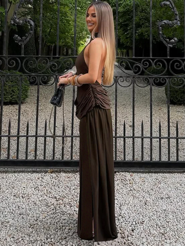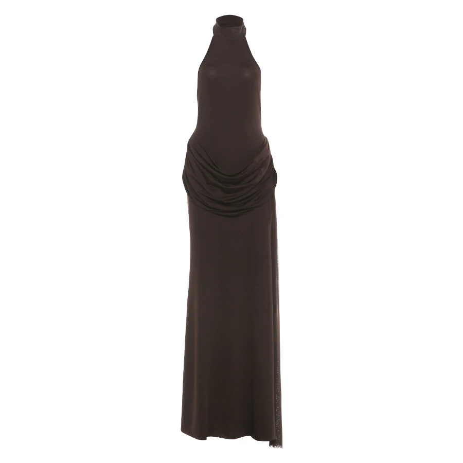 Open-back collar maxi dress with pleats and slit design - Bianca