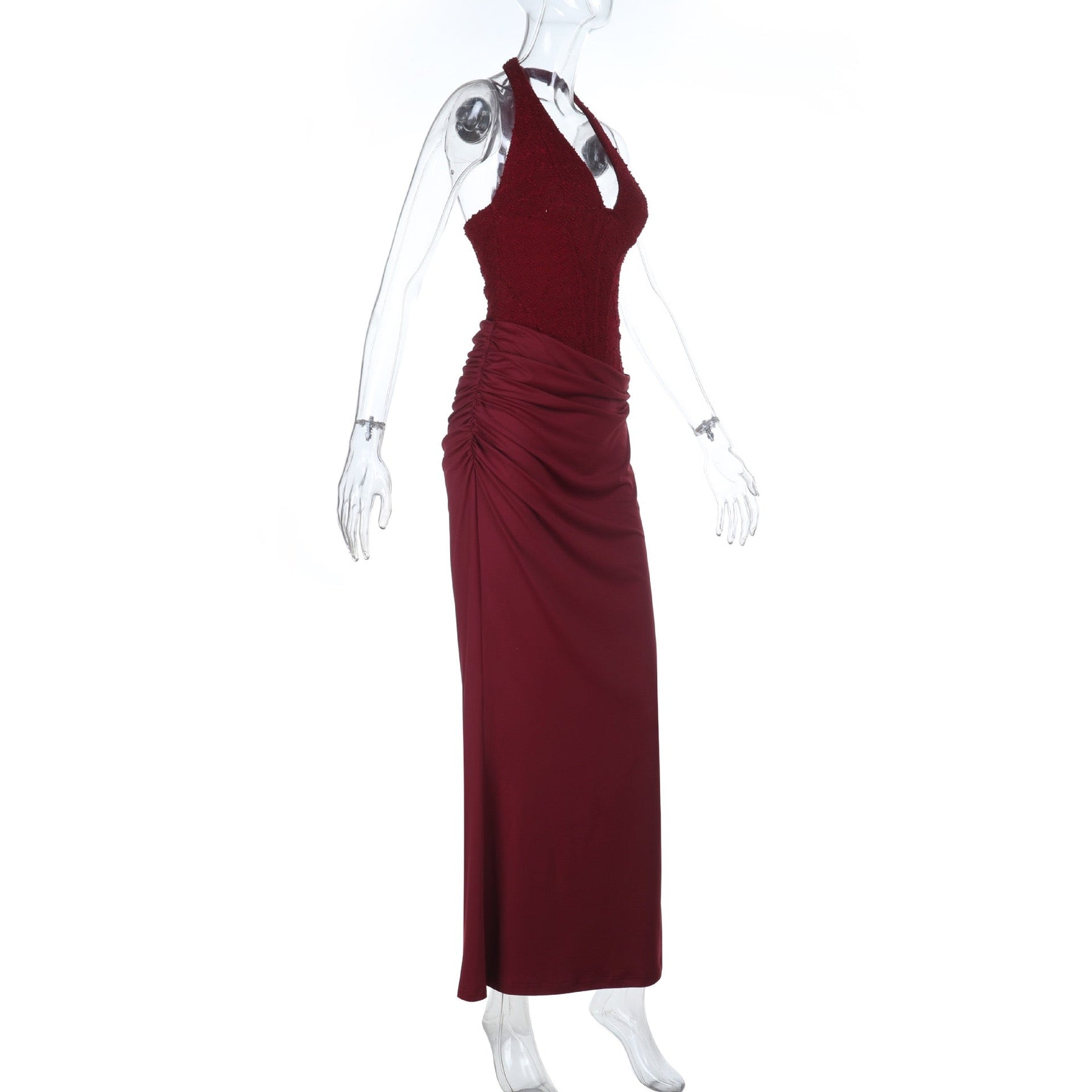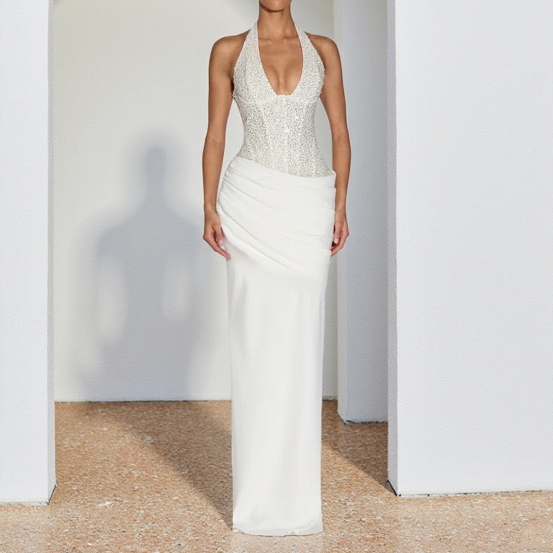 Maxi dress with sequin design, tie at the back of the neck, open back - Orlin