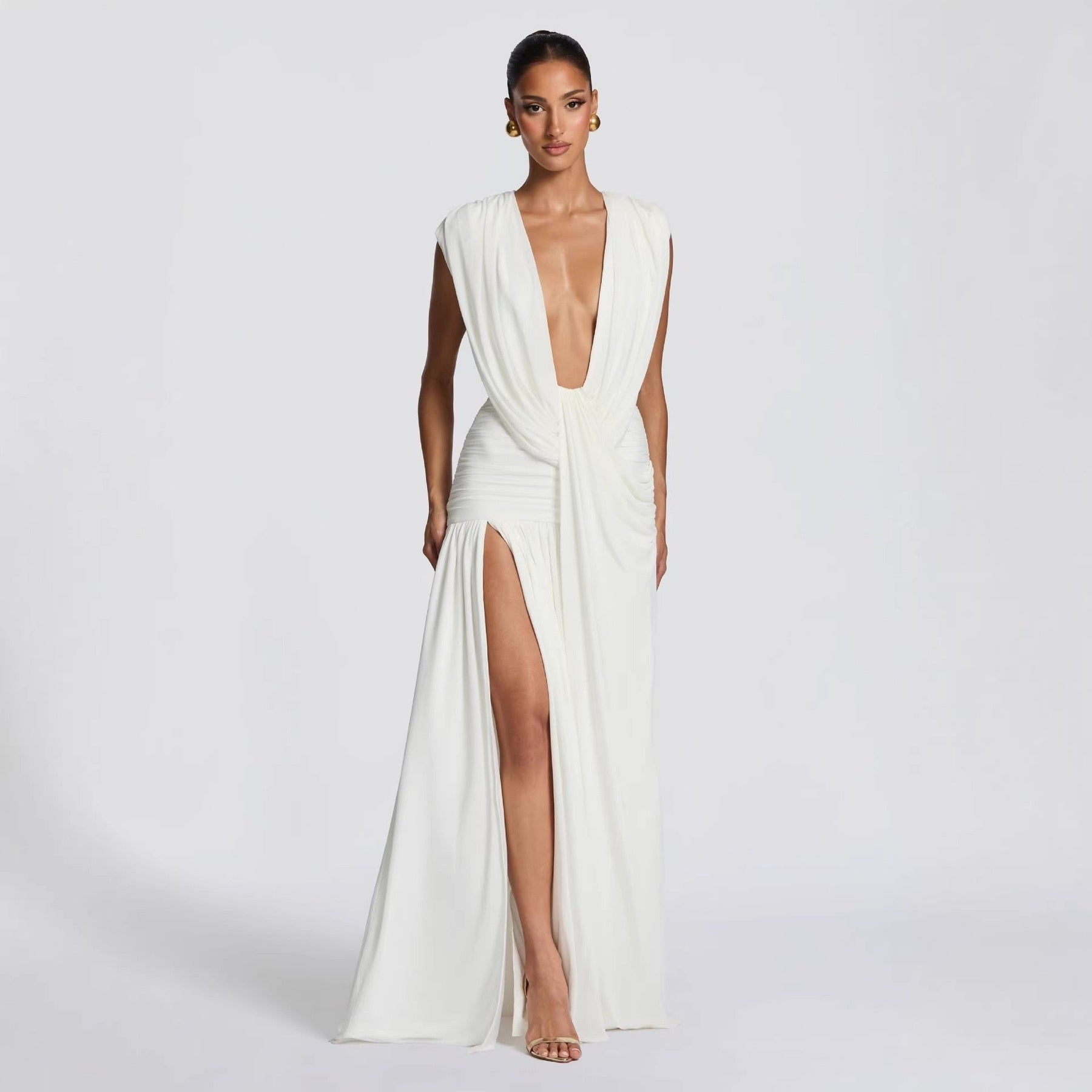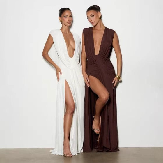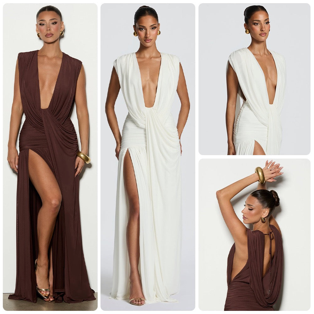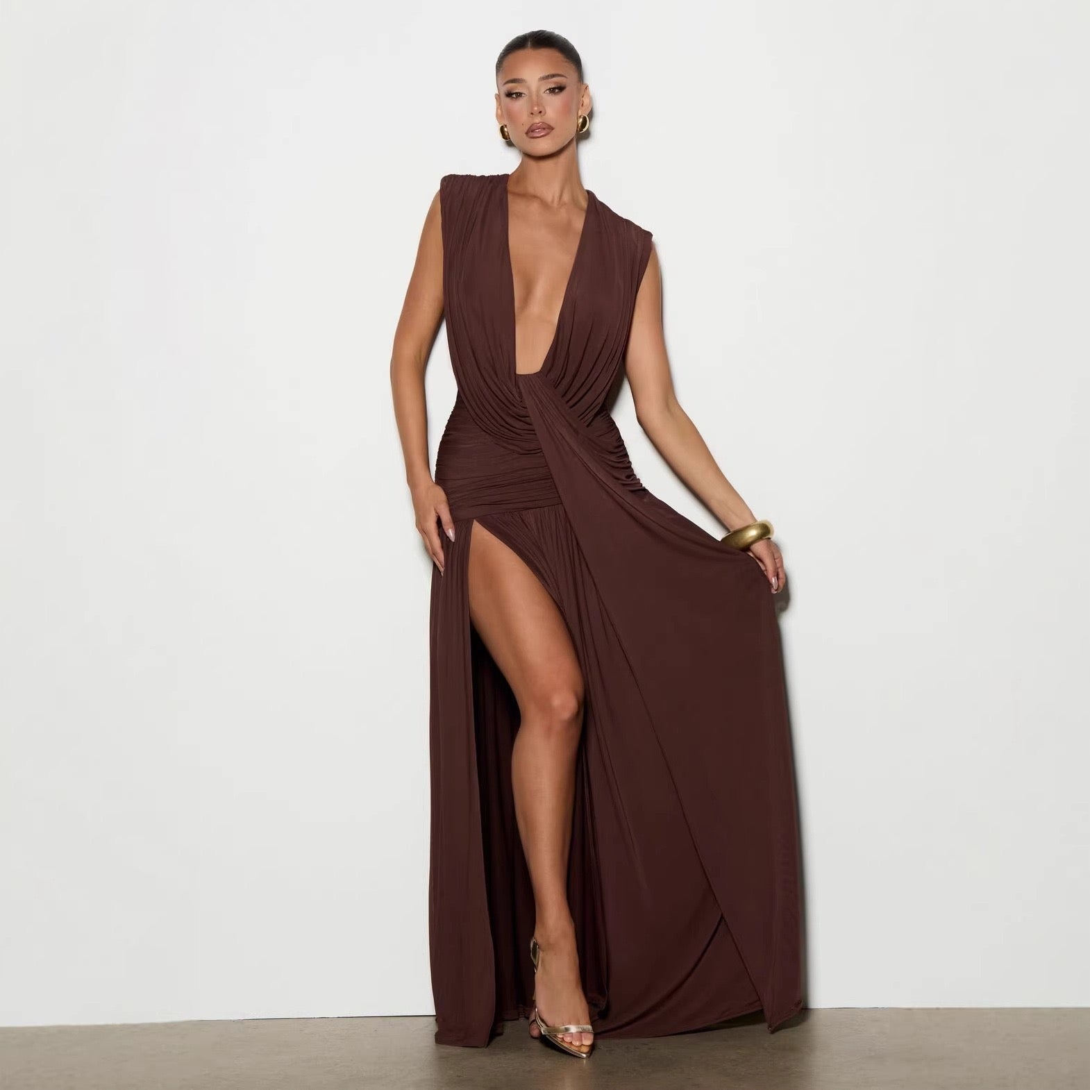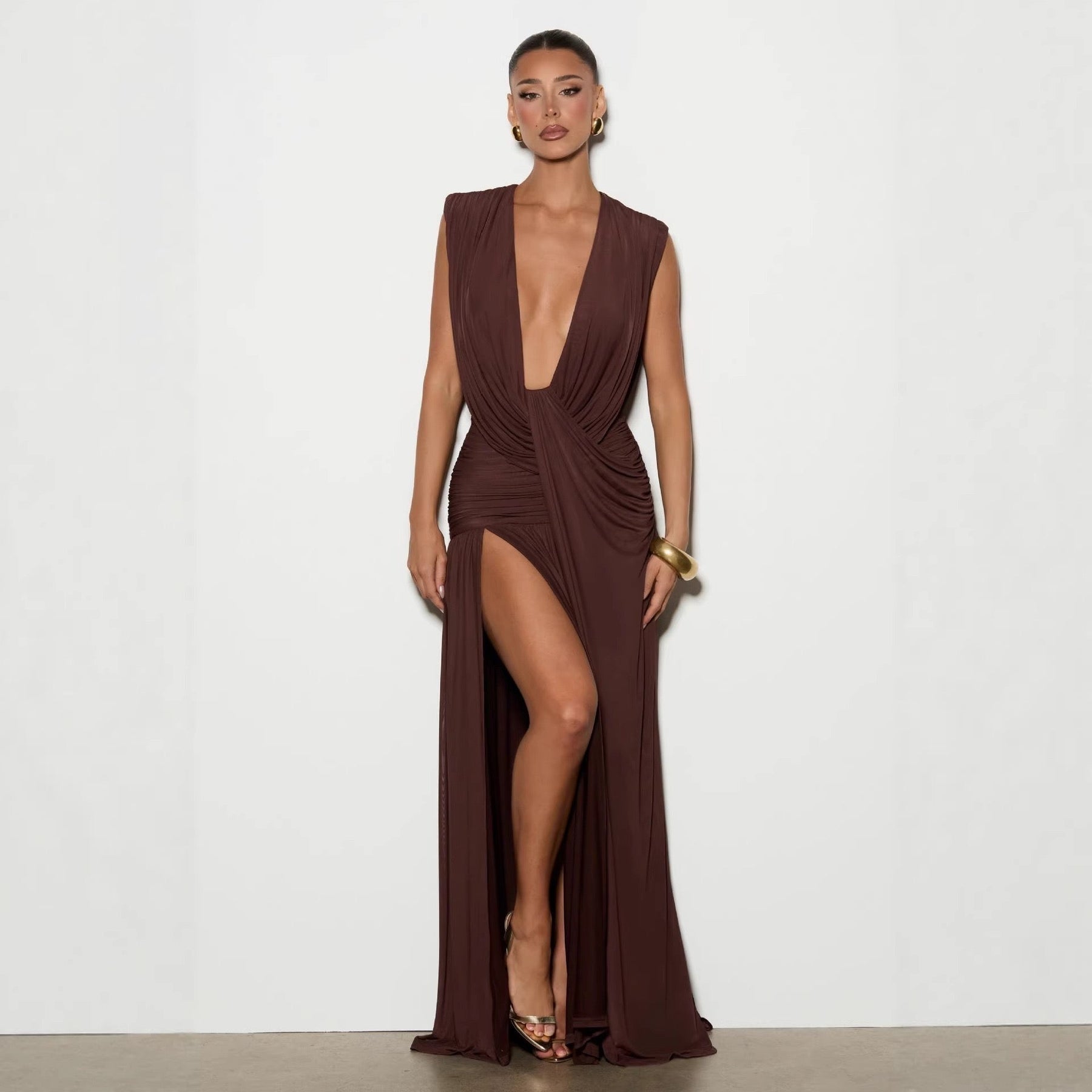 שמלת מקסי קיפולים בעיצוב גב פתוח ושסע - pnney