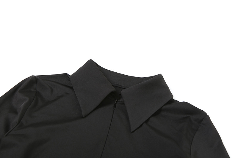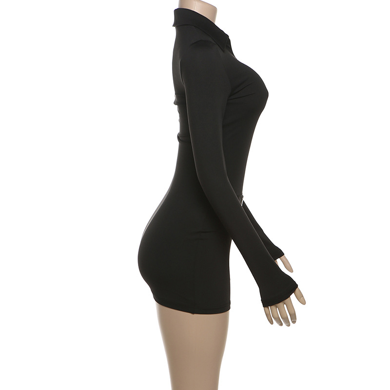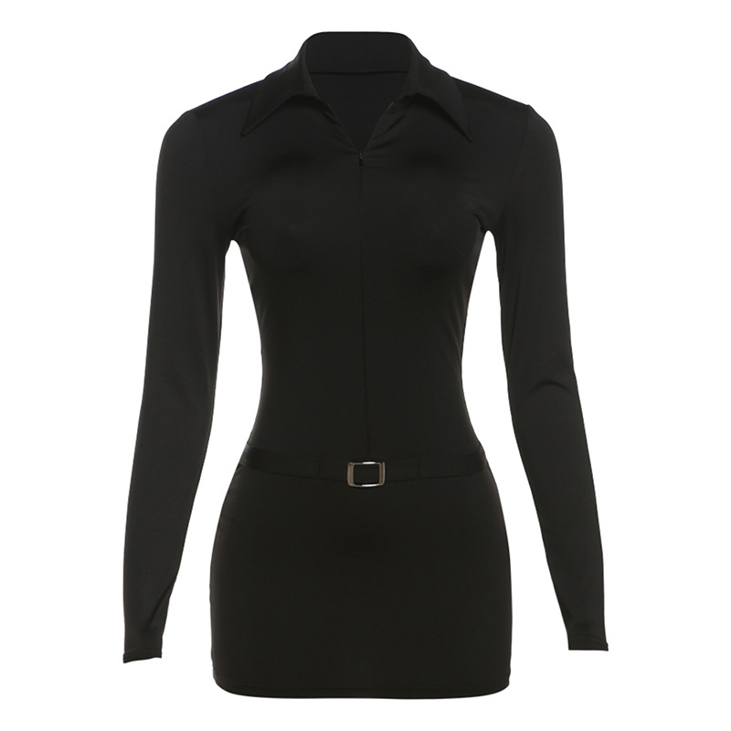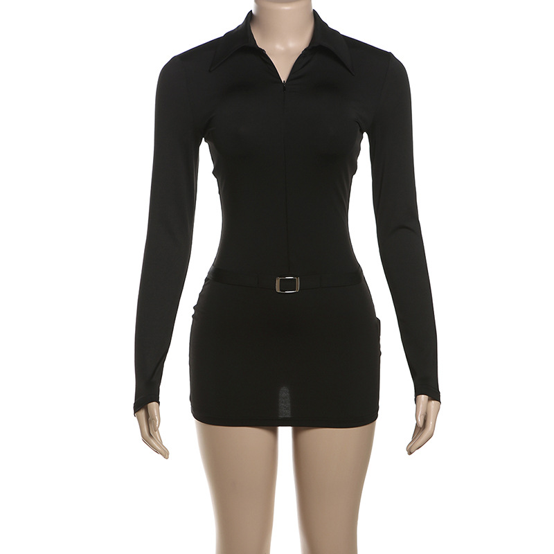 Sexy Woman Mini Skirt Belt Zipper Turn-Down Collar Dress